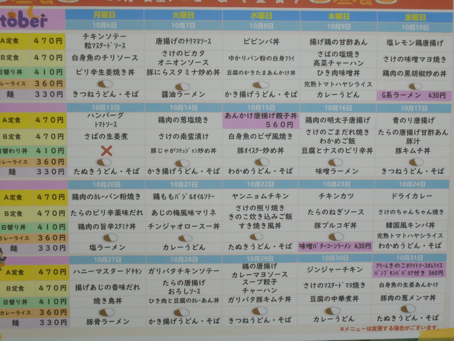 10/6(月) A:粒マスタードのチキンソテー B:チリソースがけ白身魚のフライ 丼:ピリ辛生姜焼き 麺:きつねうどん・そば
