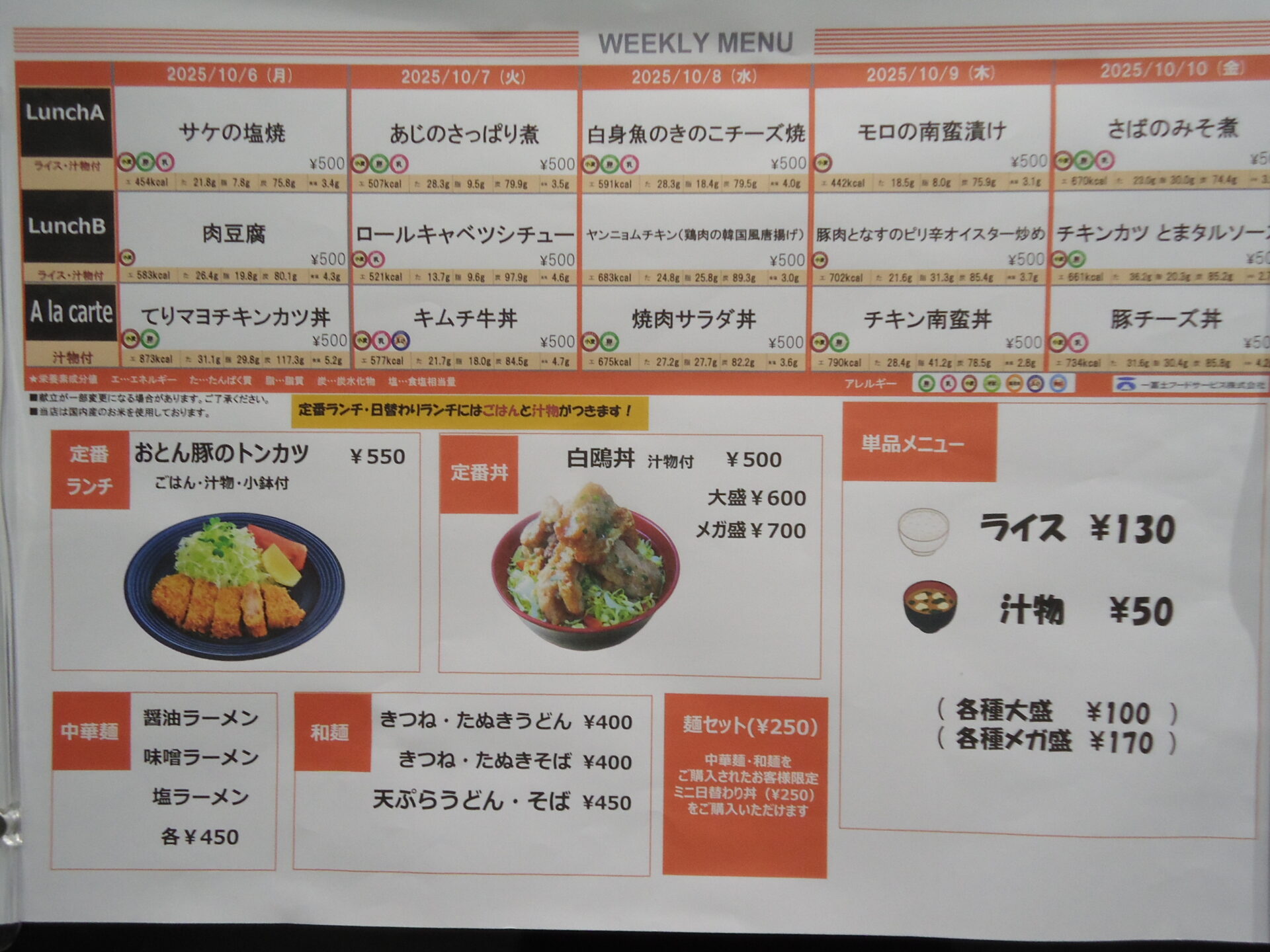 【かもめ食堂】昼食メニューのご案内(2025/10/6~10) 昼食2025年10月6日 - 10日 かもめ食堂 X Facebook はてブ LINE コピー 2025.10.06 2025年10月6日 – 10日 かもめ食堂 10/6(月) A:鮭の塩焼き B:肉豆腐 丼:照りマヨチキンカツ10/7(火) A:鯵のさっぱり煮 B:ロールキャベツシチュー 丼:キムチ牛丼10/8(水) A:白身魚のキノコチーズ焼 B:ヤンニョムチキン 丼:焼肉サラダ10/9(木) A:もろの南蛮漬け B:豚肉となすのピリ辛オイスターソース炒め 丼:チキン南蛮10/10(金) A:サバの味噌煮 B:とまたるソースのチキンカツ 丼:豚チーズ丼 Tweet